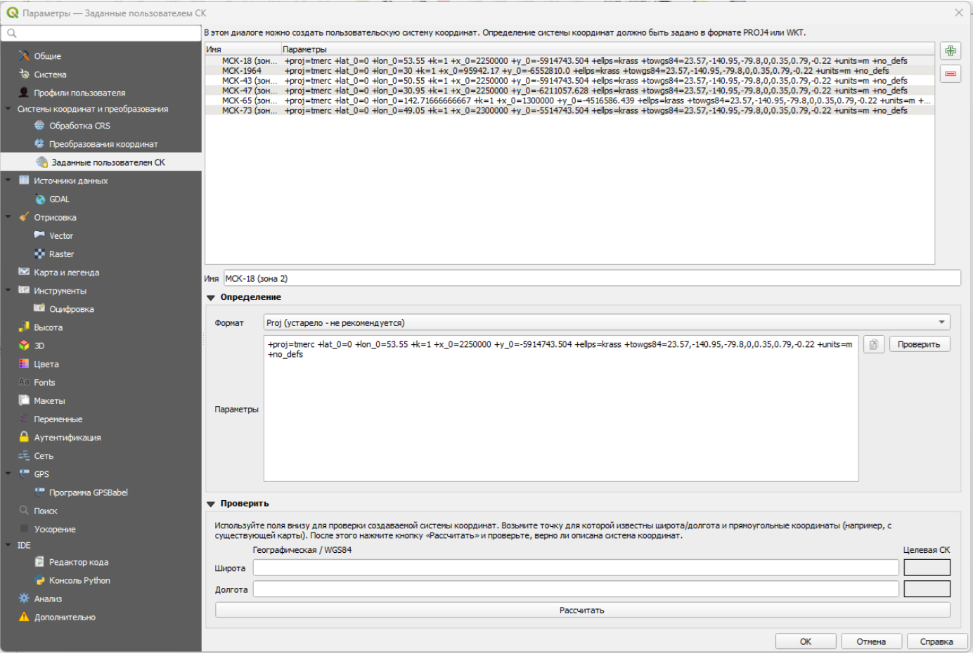 В открывшемся окне QGIS «Параметры – Заданные пользователем СК» создать новую систему координат, нажав иконку