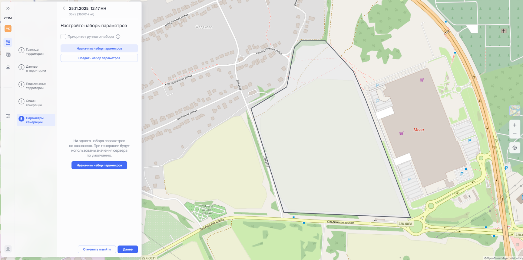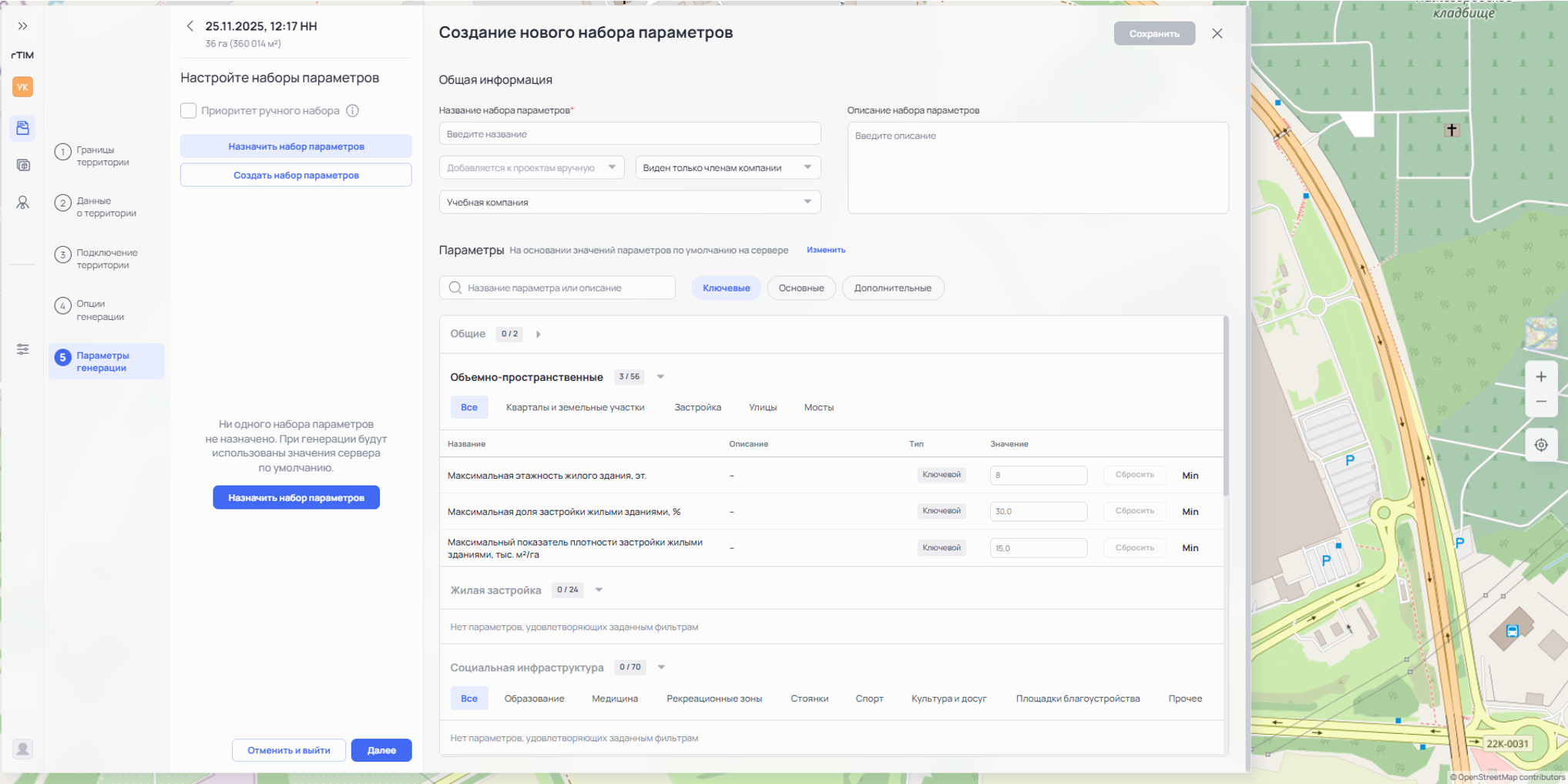 Следующим шагом при создании проекта является назначение набора параметров генерации. На этом шаге задаётся более точная настройка общих, объёмно-пространственных параметров, жилой застройки, социальной и коммерческой инфраструктуры, транспортной инфраструктуры и маятниковой миграции, инженерной инфраструктуры, экономики, санитарно-защитных зон и квартирографии, к которым будет стремиться алгоритм генерации при создании Концепций.