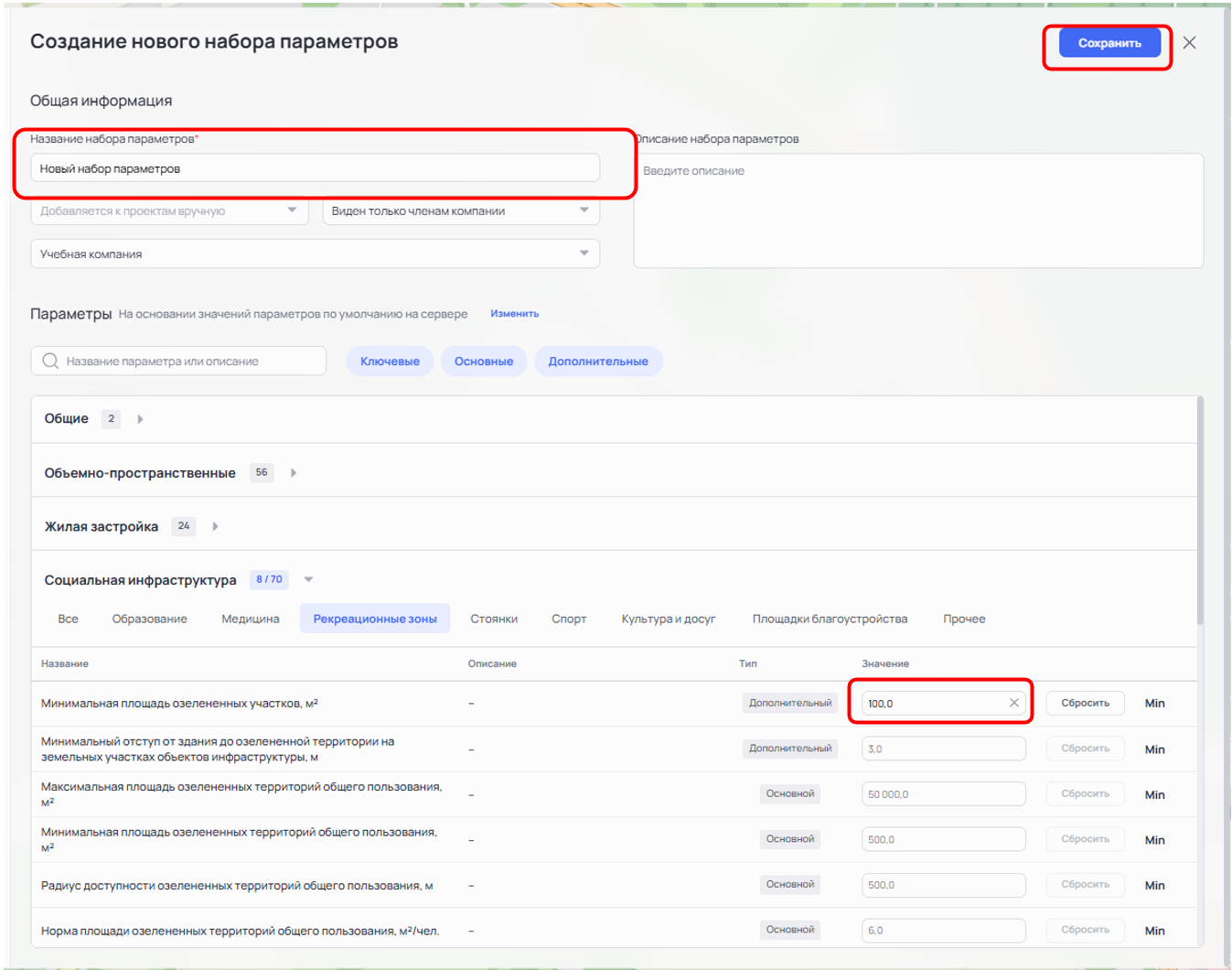 Для сохранения всех параметров со значением по умолчанию достаточно ввести вручную один параметр с тем же значением. Тогда, при условии, что введено название Набора параметров, кнопка «Сохранить» станет активной.