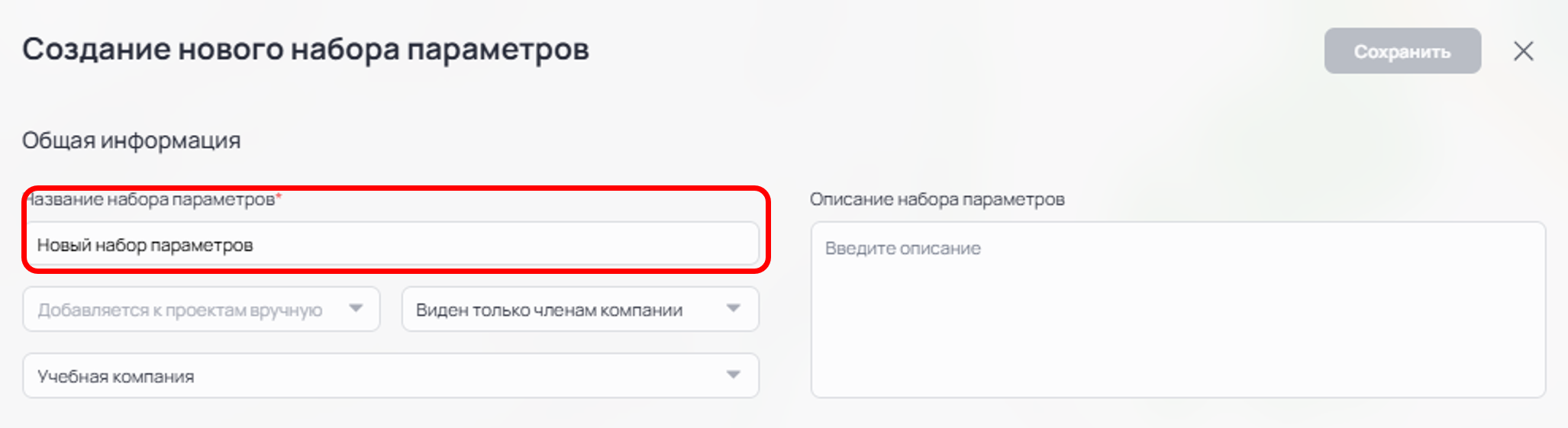Если для проекта ещё не создан необходимый Набор параметров, то при выборе соответствующего пункта откроется карточка Создания нового набора параметров.