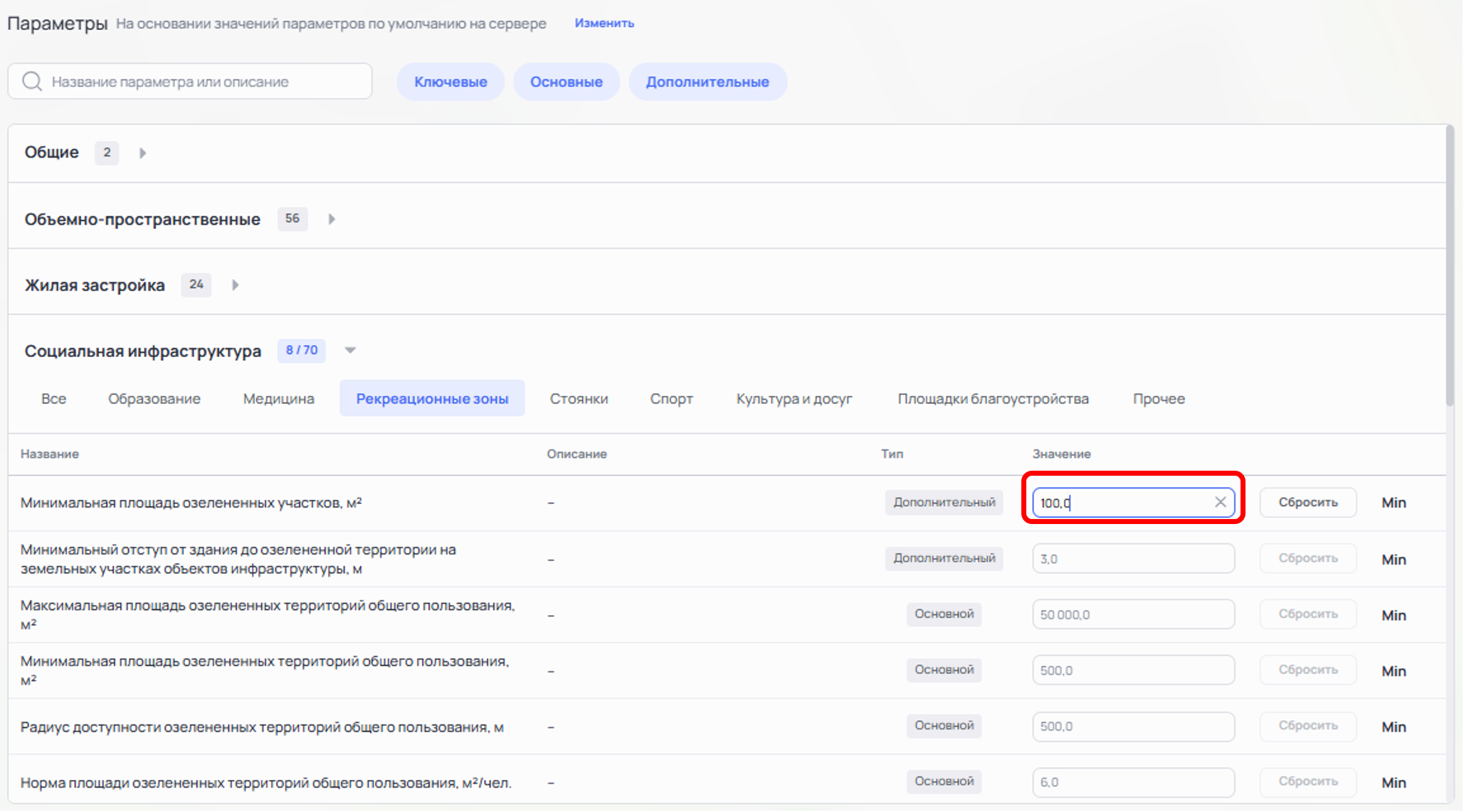 Клавишами-стрелками вверх и вниз можно увеличивать или уменьшать уже введённое значение (с шагом 1 для целочисленных параметров и 0,01 для остальных). Введенное значение параметра можно вернуть к значению по умолчанию, нажав ЛКМ крестик в поле ввода, или вернуть к ранее сохранённому в Наборе параметров значению, нажав ЛКМ кнопку «Сбросить».