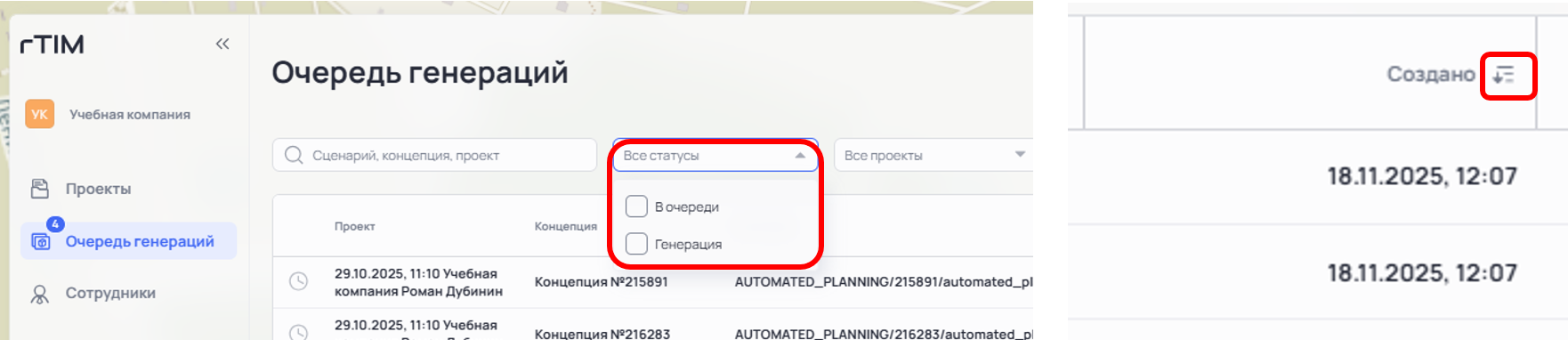 В таблице «Очередь генераций» отображается информация о Проекте, Концепции, названии Сценария, запустившем её Сотруднике, дате и времени запуска Генерации и её длительности.